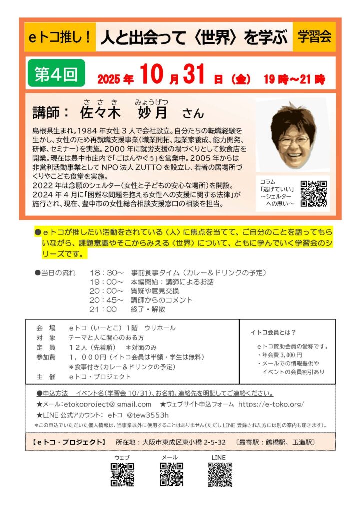 ●eトコが推したい活動をされている〈人〉に、ご自分のことを語ってもらい、そこからみえる〈世界〉について、ともに学ぶ学習会です。ご参加お待ちしています。